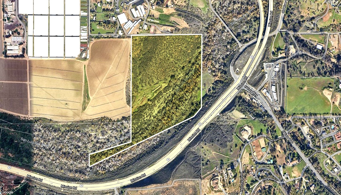 • Vacant rural land • APN 126-260-18 and 170-020-01 • The subject is composed of two contiguous lotsof vacant land with a total site area of 36.3 acres or 1,581,227 square feet • Approximately 93% of the total site area has sensitive vegetation and potential for critical habitat for endangered species, which renders the site undevelopable • The site is zoned both general agricultural and limited agricultural • The highest and best use for the site is conservation or mitigation use • Located just north of Mission Road (CA-76) and just west of Old River Road/East Vista Way (S13) • The San Luis Rey River runs through the property • Approximately 8 miles east of the I-5 Freeway and the City of Oceanside • Approximately 6 miles west of Pala Mesa and the 15 Freeway • Camp Pendelton is approximately 5 miles to the northwest • Fallbrook is approximately 8 miles to the north • Vista is approximately 4 miles to the south